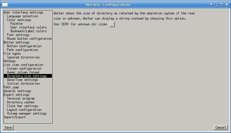 In this section you can select whether a generic text or the inode size of a directory should be shown if the actual size of the content is not known (which can be calculated by the dirsize command).