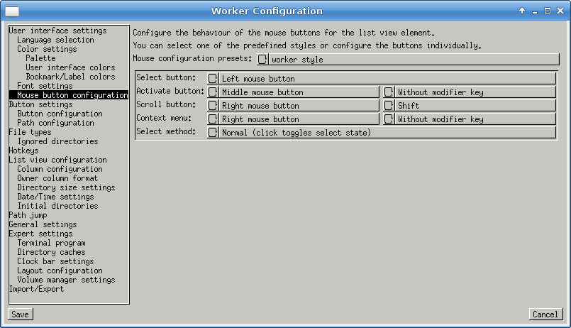 The mouse buttons can be configured for different behavior. You can choose between different predefined styles, or select the mouse button for each action individually.
