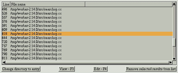 Below the search parameters you can find the list of results. The complete file name is listed and, if the file content was checked, the line number.There are buttons available for manipulating the results.